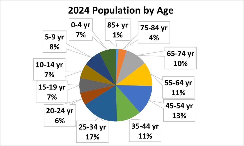 The City of Racine shows a relatively balanced distribution across most age groups, with the 25–34 age group representing the largest segment of the population. In contrast, residents aged 85 and older make up the smallest proportion.