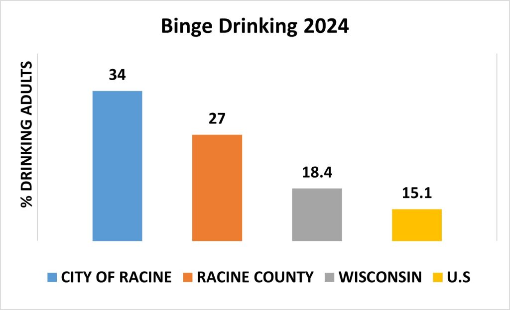 Excessive drinking reflects the percent of adults binge-drinking (males having five or more drinks on one occasion; females having four or more drinks on one occasion) and/or drinking heavily (women having more than one drink per day; men having more than two drinks per day, on average). In 2024, City of Racine and Racine County have a higher percentage of the population that reports excessive drinking than the State of Wisconsin and U.S.