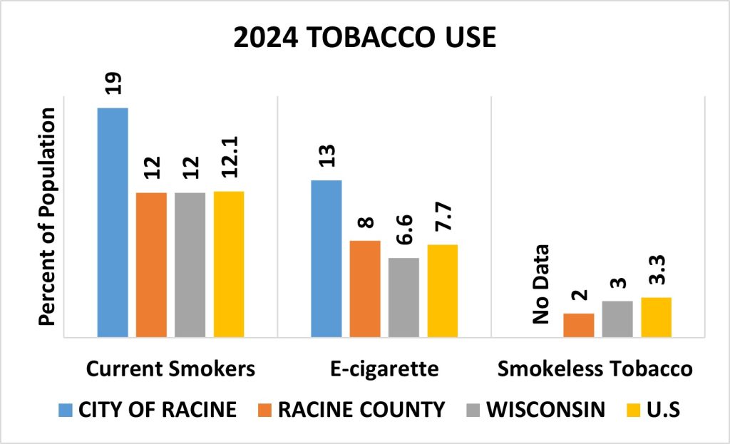 Roughly 19% of City of Racine adult population residents use some form of tobacco product which is higher than Racine County, the State of Wisconsin, and the United States. Other tobacco products include smokeless tobacco, cigars, cigarillos, pipes, and e-cigarettes (“vaping”).
