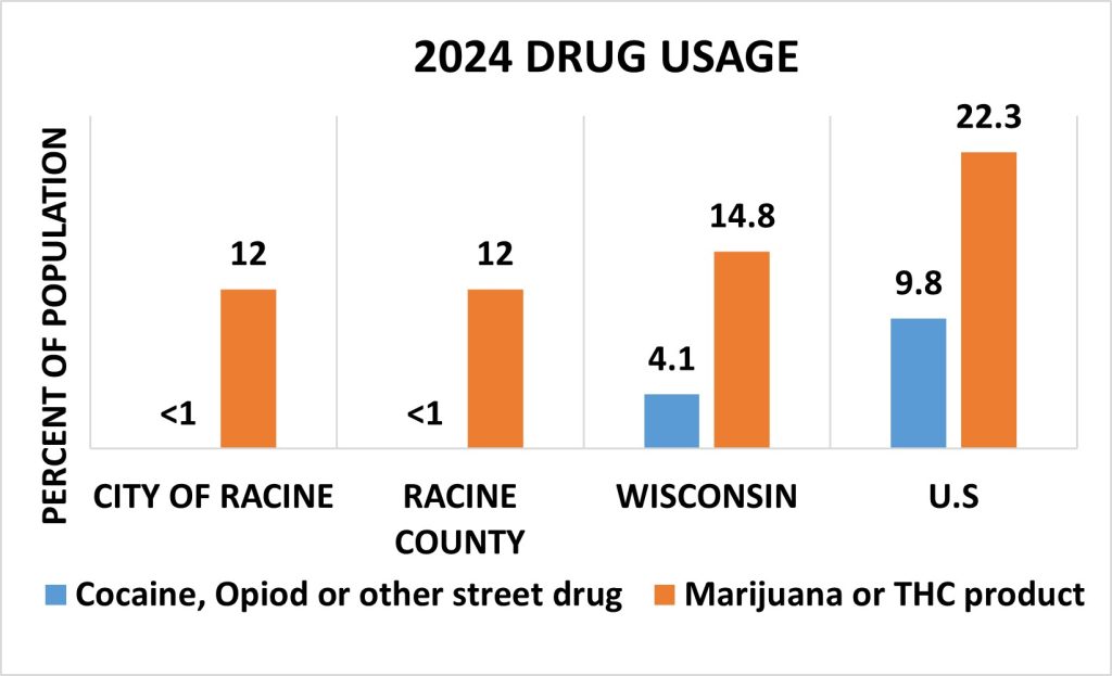 Illicit drug use poses serious health risks and is linked to addiction and disease. The City of Racine and Racine County report similar rates of past-year use of cocaine, opioids, and even marijuana among residents. However, rates across Wisconsin and the United States are significantly higher.