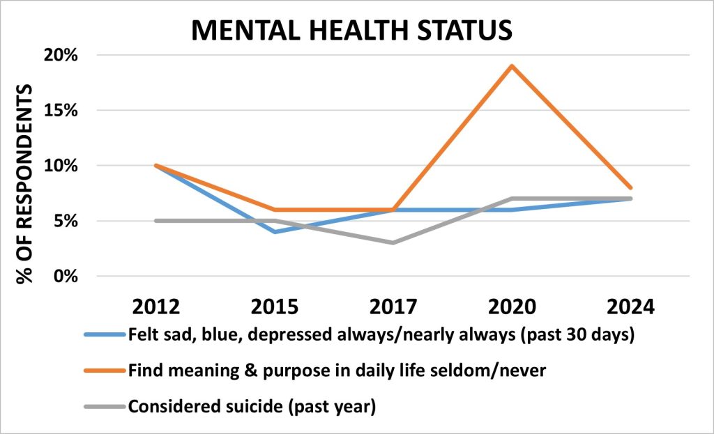 In 2024, the number of people reporting that they seldom or never find meaning and purpose in daily life dropped significantly compared to 2020, while levels of reported depression and sadness remained largely unchanged. Number of respondents for considering suicide also slightly increased from previous years.