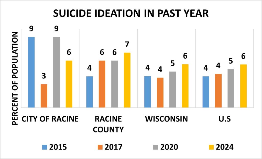 The City of Racine and Racine County report the highest percentages of residents who have considered suicide in the past year, compared to both the State of Wisconsin and the United States. While rates are rising across all areas, the increase is especially pronounced in Racine County, Wisconsin, and nationally