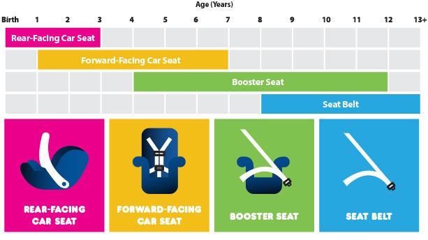 Wisconsin Law requires children to be in a car seat until age 4 and 40 pounds, and in a booster seat until age 8, more than 80 pounds, or more than 4’9″ tall.
