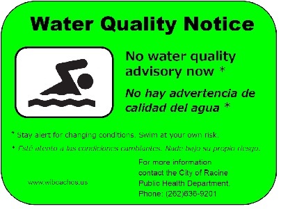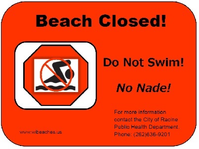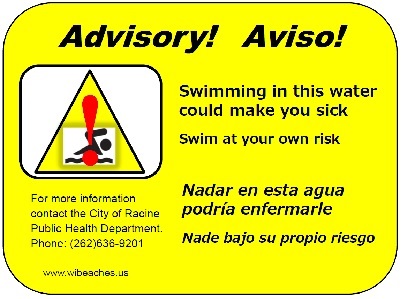 If the water has any of the above signs, do not go into the water and do not let children or pets play in or drink it. In addition, the Public Health Department Laboratory has signs warning beach visitors about the presence of HABs in Racine. Do not enter the water if one of these signs is posted.