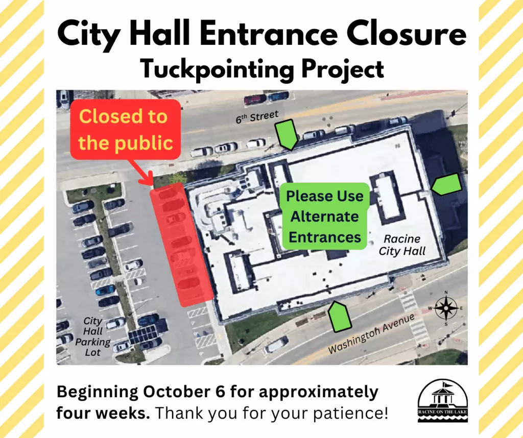 Beginning Monday, October 6, 2025, tuckpointing work will begin on the west façade of City Hall. The project is expected to last approximately four weeks.